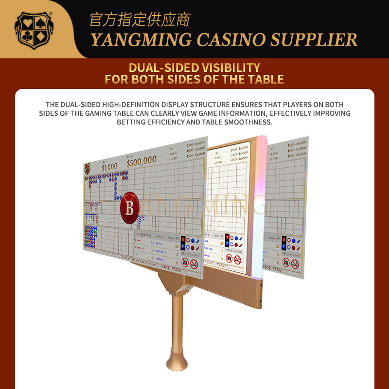 نمایشگر کازینودارای نورپردازی روشن LED و طراحی باریک و مدرن، که دید واضح را از هر دو طرف میز تضمین می کند. این دستگاه برای عملیات مداوم کازینو ساخته شده است و عملکرد پایدار، گرافیک زنده و زاویه دید وسیع را ارائه می دهد. ایده آل برای باکارا و سایر بازی های رومیزی، از محتوای قابل تنظیم، نمایش چند زبانه و برندسازی لوگو برای افزایش کارایی مدیریت بازی و ارائه کلی کازینو پشتیبانی می کند.نام تجاریYANGMING
